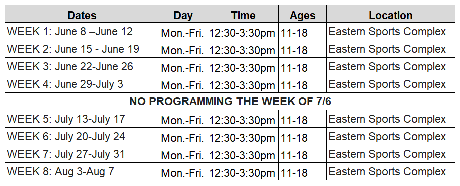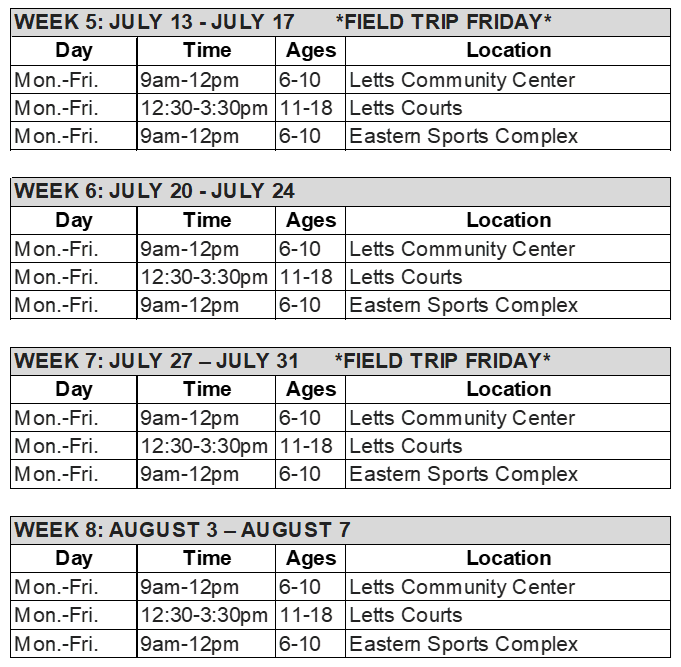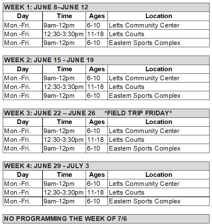 Programming will take place at two sites: Letts Community Center & Eastern Sports Complex.